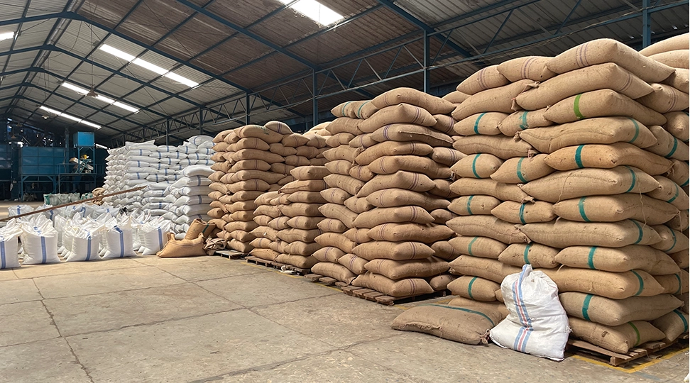 The selected green coffee beans are prepared for roasting and packaged to maintain their moisture balance.
